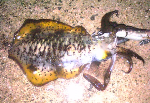 こんにちわ!只今 休憩中です。明日から三日間、「二月九日、年に一度のニクニクセール」です。今日からセールの準備が忙しく 帰ってPCできるか分からないので 今、携帯で更新です。さて、行って来ましたよ、寒い中。和歌山中紀、いつものポイントです。写真はダーリンが三投目に釣ったチビイカちゃん私には来てくれなかった(T_T)それでメバリングしよ~とやってみたけど、ここ前も釣れなかった…メバル居ないのかな?見えるのは スズメダイ、豆アジ、イワシだけメバルの姿は見えない。ガシラの様に 釣ってると出てくるのかな?と思い まず アイスジグ 壁際に落として上下してみるけど 生命反応なし…(T_T)フロート玉であちこち投げてみるが やっぱ生命反応なし…(T_T)カブラを使ってみた…(T_T)最後に 最終兵器 メタルバイブをFumiさんに教えて頂いたように 後のフックを外して あちこち投げたり 下に落としたり ブーンブーンと やってみるも やっぱり(T_T)一度だけ 強いアタリがあり ロッドが大きく曲がるが フッと軽くなった…何だったのかな?ガシラ?シーバス?メバルなら かなりデカかったはず…(T_T)この場所 季節は秋?豆イカ(コロッケ~トンカツサイズ)の群れがあちこちに いました。墨後だらけです…こんなに 沢山イカの群れを見たのは初めてです。でも エギには反応なし!当たり前です。餌のアジが まるで 絨毯の様に 海面一面にウヨウヨ~!海底にも ウヨウヨ~!それが弱るのを 待っているのです。色んな色のエギを落として見るも 知ら~ん!アジだけを見ています。ダーリンはピンクだけ触りに来たと言ってまた ムキになってます。しばらく して…「やった~!やっと釣れた!」ダーリン豆二匹目GET( ̄▽ ̄;)私はどうも サイトエギングは苦手(>_<)寄って来ても すぐに離れていくので イラッ!(-_-#)私の方が短気?(・・?)夕方 風が暴れ出したので撤収私は○ボだよっ!何か?では またねっ!(^O^)/