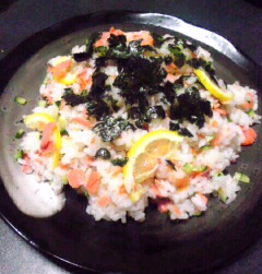 我が家の 親子寿司 は、甘めの寿司飯に 塩鮭 (焼いてほぐす) 、三つ葉 (写真はキュウリ) 、を混ぜ混ぜ、海苔、イクラ、レモンを飾ります。 (簡単!きれい!美味しい!)
