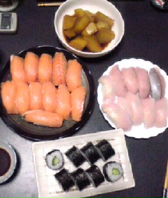 仕事終えて帰る時にブリとサーモンのお造り用ブロックを買って帰ると、握ってくれました。