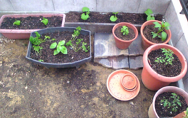 キュウリ、ゴーヤ、トマト、オオバ、パセリ、シシトウ、お花 を植えました。