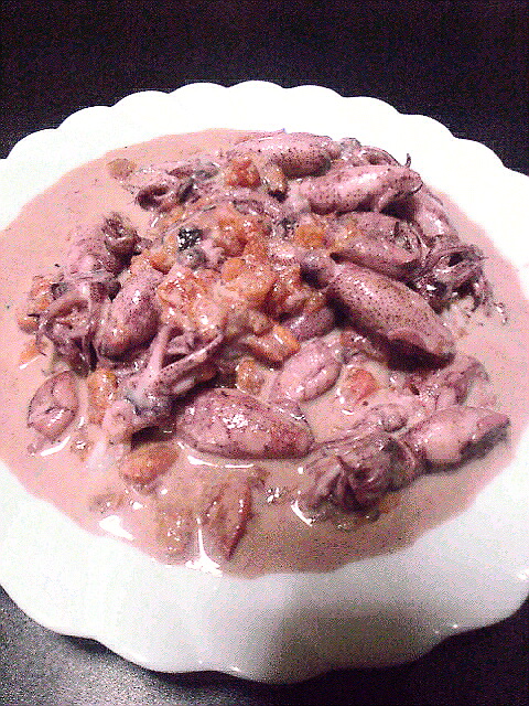冷凍しておいた ヒイカ (または貝柱)をオリーブ油で炒めます。
