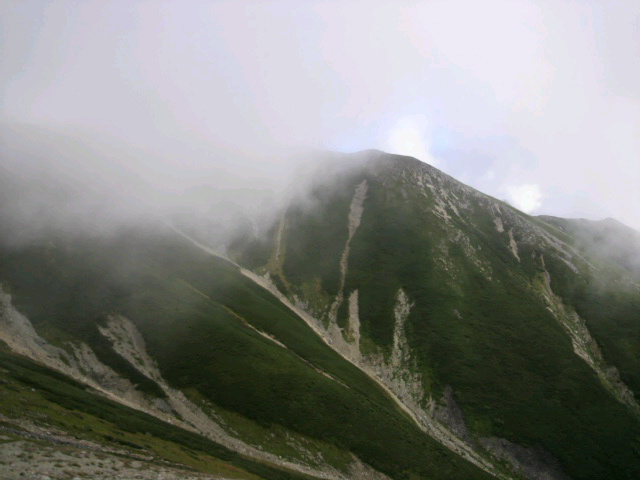 14時に薬師岳山荘に到着しました 明日朝、アタック予定です ガスが晴れて、ちょっと見えてきました 途中、お花畑があり、チングルマの群生がありました 雷鳥も鳴き声は聞こえますが、姿は見せてくれませんでした