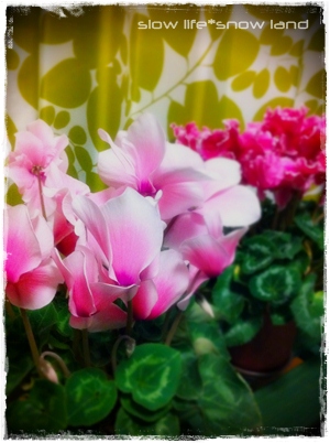 昨年に引き続き、実家の母からシクラメンを2鉢もらいました。昨年のシクラメンは 夏にダメになった@夏の過ごし方が難しいよ・・・。今は元気に咲き乱れておりますが。花壇ももうすっかり雪の下なので部屋の中にお花が咲くと ほっこり嬉しい。写真はお手軽なiPhoneでパチリ&加工。iPhoneでも1M程度の高画質写真を撮れるしいろんなアプリで加工できちゃうので楽しい。(ちなみにこの写真は、PCで枠を加工してます)あぁ…すっかり iPhone中毒だわ。@HOMEにもどうぞ~ トップ掲載雑貨 更新!!@ 毎日の励みになりますぅ!応援ありがとうございます!そういえば 12/10限定タイムセールのイッタラ。無事に ぽちっとお買い上げできました。やった~。やった~。しかしお皿ばっかり増えて 料理の腕が未だ上がらず@