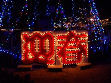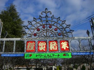 「新年明けましておめでとうございます。」気がつけば、2ヶ月ぶりの更新となりました。昨年11月25日から始まった、地元の公園ライトアップ「第7回大和夢ナリエ」のお正月の風景です。このアーチをくぐると夢がかなうといわれる、「ドリームカムアーチ」に「謹賀新年」。シンボルツリーの足元に「迎春」夕方5時から、ライトがついてとてもきれいです。おとづれる人を出迎える「ウェルカムアーチ」も夜になると、青く妖しい光を放ちます。地域のおっちゃん、おばちゃんがコツコツつくりあげている、わが町の冬の歳時記です。この次は、点灯している様子をご紹介しますね。本年も皆様にとって、健康で稔り多い、楽しい一年となりますように・・・。