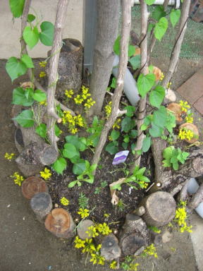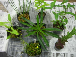 熱中症になりそうな天気だった先週。地元の緑化協会の「鉢で楽しむミニ・ウォーターガーデン教室へ行ってきました。当日の植え込みの植物7種プランターと間仕切りの型紙。鉢底に2つのキャップの付いた穴がありました。間仕切りの木材と3種の用土。水の防腐用、植え付け用、表土の重たい花崗岩の粒。いろんな種類の用土があるんやねー。出来上がり。玄関先においてみました。黒メダカの子どもが5、6匹住んでます。夏の涼感、いかがでしょうか。ミニウォーターガーデンに熱中しそうです。