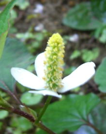 梅雨に入って元気に花を咲かせている花・・・ ドクダミ。独特の臭いで、地下で根っこを広げて庭のあちこちから顔を出す。掘り起こして根を採らないと、どんどん増えてゆく。我が家ではあまり歓迎されないが、花が咲くこのごろはかわいがってもらえる。乾燥させて、焼酎とでいい化粧水もできるそうです。八重咲きのドクダミをはじめて見ました。しばらく鉢で飼ってみましょ。