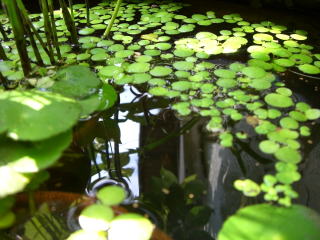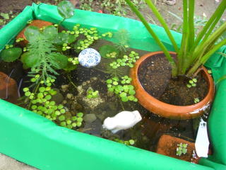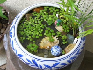 今週で梅雨も明けそうな関西です。大雨だったり、強い日差し、地面からの湿気でムンムン体調がおかしくなりそうなこの頃ですね。覚えたミニ・ウォーターガーデンを応用して、水盤にWGを作ってみました。玄関先に並べておいてみました。もちろん、メダカが入居しました。倉庫の奥にあった漬物かめにも・・・。炭を入れていたガラスのバケツにも。結構涼しそうで、気にいってます。泳いでいるメダカもよく見えます。ボウフラを食べてくれるメダカさんたち・・・。これから沢山自然のご馳走を、たらふく食べて大きくなってくださいね。ウォーターガーデンの植物は、近くの池や川、田んぼなどの水辺に自生しているのがいいそうです。(花屋さんで買ってもいいのですが)炭や活性炭を入れると水が腐りにくくなります。(水に浮くので重しがいりますよ)身近なものでミニビオトープ。トンボもやってくるそうです。夏の涼感、一度トライしてみるのもいいのでは。