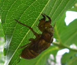雨上がりのひと時、ウツギの葉っぱの裏側にバルタン星人が・・・。動くか触ってみたら、抜け殻でした。先週からセミがチラホラ鳴きだし、夏本番ををPR?彼女を探して鳴いているんでしょうね。子どもの頃、夜中に幼虫からセミになっていくところを、見ていたことを思い出しました。薄い黄緑色の羽が背中から出てきて、なんとも神秘的な光景でした。殻から出て1週間、鳴いたり飛び回ったり成虫の短い命とはいえ、たくましさを感じますね。この梅雨が明けたら、朝早くから目覚まし代わりの大合唱が始まります。梅雨明けの前には羽蟻がわんさとやってくるのが、我が家の梅雨明けメッセージです。