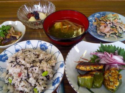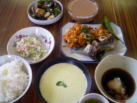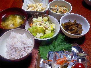 暑いですね~。こう暑いと食欲もなくなってしまいそうです。今日は、久しぶりに夕食のアップです。いつも同じようなものなんですけれど。五穀飯、しめさば、おからの煮物、ニガウリの煮物、山芋、ポテトサラダ、みそ汁シメサバは、宮崎から十日に一度くらい来られるおじさん(お兄さん?)から買っています。付け合わせの青じそとミョウガは裏庭で自然と生えてきたものです。ミニトマトは近所の方からのいただき物です。おからは、ずっと前に冷凍保存していたもの、一袋十円の1/4を使って、一応自家栽培のニラと残り野菜を入れています。ニガウリは、地元産でチリメンジャコとおかか入り山芋は細く切って酢醤油をかけただけポテトサラダは、つぶさずにマヨネーズを入れてさっとあえています。マヨネーズを減らすためです。輪切りにしたウインナーとミックスベジタブルも入れています。みそ汁には、ナスとえのき入り。(ナスはいただき物)五穀飯は、地元の農家の方が500g500円で温泉センターなどに出してあるものです。市販のものよりずっと安くておいしいんですよ。いつもより品数が多かったので久しぶりにアップしてみましたが…ニガウリの煮物(佃煮?)は、お勧めなのでレシピをご紹介しますね。友だちの友だちから教えてもらったものです。ニガウリ1kgに対して、濃口醤油100cc、薄口醤油50cc、酢100cc、砂糖200gです。シラス干しと調味料を入れて煮て、最後にカツオ節を入れてできあがり!今回は1本で作ったので、この分量の1/4にしました。濃口と酢を大さじ2杯、薄口大さじ1杯、砂糖大さじ4杯くらい?甘酸っぱくて苦みはほとんどなく、ご飯がいくらでもいけますよ。でも、私はニガウリの苦みも好きで、よくゴーヤチャンプル風にもしますけどね。原油高高騰に加えて、食品も値上がりしているのでできるだけ地元の旬の野菜を使ってヘルシーメニューをと思っています。ところで、先日は温かいお言葉をたくさんいただいてありがとうございました。みなさんもいろいろな思いをしながらブログを続けていらっしゃるんだと思うと何だかホッとしました。そうそう、お気づきかと思いますが、ニックネーム変えたんですよ。(今から二時間後に変わるそうですけど)秋桜サファイアは、9月の誕生花と誕生石なんですが、どちらも、もう他の人が使っていらっしゃったのでくっつけていたんです。でも、長いので秋桜だけにして☆や♪をつけようと思ったら☆秋桜、秋桜☆、☆秋桜☆、♪秋桜、秋桜♪、♪秋桜♪も…全部ダメだったんですよね~。それで、☆秋桜♪をしたらOKだったので、取りあえずこれに決めました。ちょうどみなさんからも「秋桜さん」とコメント欄に書いていただいたので、変える決心?が付きました。と言うわけで、これからは、☆秋桜♪でよろしくお願いします。あっみなさんは、秋桜だけで結構ですよ~。今日もご訪問ありがとうございました。