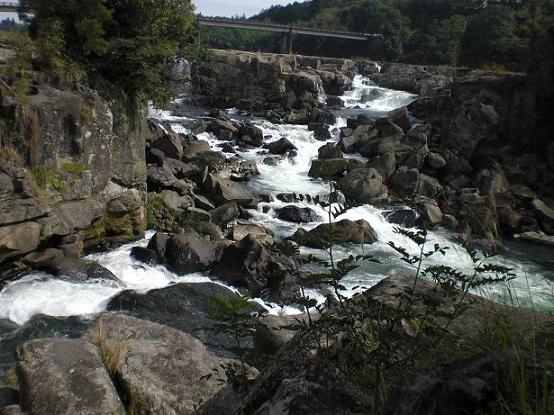 椎場村から五ヶ瀬への道は、道幅も広くビュンビュンとばすことができます。さっきまでのくねくね道が嘘のようです。1で「ちょっと不思議体験をした」と書きましたが…よく考えると、それは椎場村での出来事だったんですよね。ちょっとしたことですが…山道を車で行く私たちのそばに山鳩らしきものが現れ、しばらく車と共に飛んでいたと思ったら突然前に出て、すい~~と高千穂峡目指して飛んでいったという…こちらは借り物の画像です。ごめんなさい。たいしたことがないと言ったらそうなんですけど私たちにとっては、鳥が道案内してくれているような気がしたんですよね。高千穂に行きなさい!と言ってくれたような??ハイ!それだけなんです。どんなことなんだろうと期待してくださった方?ごめんなさい!でも、何でもプラス思考で考えるのはいいですよね。さて、五ヶ瀬からまた広い道を行くと長いトンネル(国見トンネル)が現れそれを通っていくと、あっという間に高千穂峡に着きました。旧道を行くと1時間かかるところが、トンネルを通るとわずか5分なんですよね。やった~!!自力で山越えして高千穂峡に着いた!!休日は、人が多くて近くの駐車場には止められないと聞いていましたが運良く軽のところは空いていたのですんなりと止められました。ここでちょっと高千穂峡について説明しますね。高千穂峡は、阿蘇火山活動の噴出した溶岩流が、五ヶ瀬川に沿って帯状に流れ出し、急激に冷却されたために柱状節理のすばらしい懸崖となった渓谷です。さて…高千穂峡と言ったら、貸しボートでしょう?柱状節理を下から見て滝の近くまで行くのは最高です!!「さあ乗ろう!!」と友だちも張り切って乗り込んだのはよかったのですが…友だちは、全く漕いだことがないって??ペダルを踏むタイプと思っていたって??えっ?わ…私も??いいえ~~確かずっと前にカヌー体験をしたことがあった??と言うわけで、漕ぎ手の所にすわっていた友だちに代わって私がオールを握ることに…(危ないので、一端岸に戻って交代することに…係の方にはお手数かけました。)でもでもなかなか思うように進まない!!ふと見ると、高校生らしき男の子二人も右往左往していて頭の上に水が落ちてきてびしょぬれ!!思わず笑っていたら…ななんと、私たちがそのボートにくっついて動かなくなってしまった!!男の子達はず~~とぬれたまま!!ごめんね!でもその子達は、嫌な顔一つせずに私たちのボートを押してくれてやっとボートが離れて動き出しました。ホッ!そうこうしているうちに今度は私たちの頭上に水が…大笑いしながらふと水面を見ると、きれいな虹が出ていました。何かいいことがありそうな…そんな出来事の連続でマイナスイオンを体いっぱい受けて元気いっぱいになりました。真名井(まない)の滝本当は真名井の滝の向こうまで行きたかったんですけどね。滝に打たれたりしたらそれこそ笑いものになるから今回はやめて滝の近くまで行って戻ってきました。(帰りはスイスイ漕げましたよ~!)岸に着くとたくさんの人が順番を待っていてビックリ!良かった!!早めに乗っていて!私たちは全然待たなかったものね~。私たちが乗ったのは10時過ぎだったので11時過ぎに行くと、かなり待たないといけないようです。ボートに乗りたい人は、早めに行ってくださいね。真名井の滝についてはこちらもどうぞ!反対側からの画像です。爆笑ボート体験の後は早めのランチ冷や汁定食をいただきました。冷や汁とニジマスがおいしかった~!1050円は安いかな?(これは友だちのおごりでした。サンキュ!)次はいよいよ神社巡り!!高千穂神社だけのつもりが三つまわることになりました。と言うわけで、一気に書くつもりが長くなったので続きはまた次回。「神社巡りと海沿いのドライブ」(仮題)の予定です。今日もご訪問ありがとうございました。