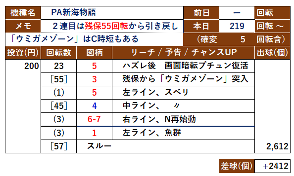 9月はスタート1日~3日までいきなりの3連敗をやらかしてしまい 収支は -10,500円 このまま海の底に沈んでしまうのかと不安ながらも迎えた9月4日 店を変えればツキも変わると 午後3時過ぎ 2nd店へ向かいます といってもこれといったアテなどなく とりあえず店内で一番マシと思われる「大アグ5」(15回当り/144回転)へ もうちょっと回して欲しかったけど こんなんしかないので仕方なく游タイムまで残りあと165 よって投資は最高3Kほどかかるが 早く当たって連してくれることを祈りつつ すると オッケイ! 投資0.6K 144~178回転目に左ライン「タコ」ノーマルからの再始動で6R STは抜けたものの サポ[28]回転目に右ライン「ジュゴン」から泡+BV+炎目で引き戻し さらにこの後も続いてくれて ラッキーにも6連目「ハピチャン」をゲット 10R当たりからさらに2回連して都合8連♪ こんなのいつ以来だろうか? 多分そんな昔じゃないと思うけど 何しろ当たりに飢えているもので思い出せないくらい遠い でも それほど嬉しかった もちろん即ヤメして 貯玉の端玉を足して4,695個 これに0.4K球借りして 細っけ~な~ てかい でも100円玉が財布の中でじゃらじゃらしているのが嫌いなのでこうするしかない 投資1K 換金5Kで収支は+4Kに 負債返済まであと6.5Kか・・・ 9月5日(木)「リング2ミドル」他 捲りたいならミドルが手っ取り早いが 何しろ打ち慣れてないので そんなもんに手を出して 大敗でもしたら元も子もない それとここんとこ腰を据えてミドルを打ったことがないので 果たして気力 体力が持つかどうか? 思うに 甘游タイマーは いわば短距離ランナー 1台に消費する時間はせいぜい30~40分程度 それを何台も打ち回って収支を積み上げる しかしミドルでは そうはいかない 確率分母も大きいし 何しろ回りが悪いので 游タイム消化までとなる2時間くらいは見ないとさらに当たらないストレスや負けの不安まで抱えてしまうので よほどメンタルが強いか パチ好きでなければ体が持たない よってそのどちらでもない自分にはミドルは向いてない それでもただのミドルなら いつでもヤメられるので気楽だが これが游タイム機となると途中でぶん投げるわけにはいかず さらに負けが嵩むと つい自暴自棄になってしまいメンタルまでやられてしまうでも そうそう悪い事ばかりは起きない たまにはいいこともあるので程度にもよるが これははある意味チャンスと捉えたい 先行き見通しの暗い甘游タイム台など 打ったところでもう先が見えている よって少し距離を置いてみるのもいい ピンチはチャンス 手持ちを拡げるには絶好の機会でもある 目当ては「リング2ミドル」 その宵越し台を狙ってみようかと ただ昨日 この台を回した人が狙っているとしたら その人に任せたい 自分はその後でいい それが常連としてのこだわり 先駆者に対するリスペクトでもある もし自分がその立場だとしたら さぞかしがっかりするだろうと思うので そうしてあげたい てちょっとカッコいいこと言っちゃったかな店入りは午後3時30分 いろいろ用事があってこんな時間になってしまったが まずは目当ての台 気になっていたので真っ先に見に行ったが空き台に しかもまだ当たりなし 開店から数時間経っているので すぐに手を付けても誰も文句は言わないが その前にまずは店内チェックから すると「遠山金さんライト」(1回当り/279回転)が打ち頃になっていたのでまずはそちらへ 放っておくと誰かに持ってかれちゃいそうなので 游タイムまで 残り確率分母ほど こんな機会はめったにない打ち出すと279~342回転目/1Kにあっさり当り 赤保留+開運の紐から「2」 しかしSTは抜けてしまい出球は238個 少なっ ST機は連しないとまず負けるのでまあしょうがない 次に「新海」にも1台打てそうな台が 確後195回転なんてめったに見かけないが ~215回転目/0.4K「ジュゴン」中ラインにバイブがかかり6R当り STはスルーしてしまったが 時短終了後まさかのSST突入告知があり そんなら最初から言ってくれよ 次に当たったのが10Rで 都合4連してくれて出球は計2,309個 この間も「貞子」は誰も打たず ならばもうちょっ放っておこうか 次に「新海」(確後147回転~)に移動して2連 さらに「大アグ」(確後205回転!)で3連 もう1台「大アグ」(確後199回転!)で2連して出球計6,554個 投資5.4Kなので1Kほどのプラス て こんだけ打って こんだけ当たりを引いても たったの千円にしかならない 1パチは儲からない次にようやく「リング2ミドル」(宵越し535+本日86 -ST74 =547)へ 游タイム突入条件は884なのであと337回転 回りは@60はムリだろう おそらく@55がいいとこ? いやもっと酷かった 86~183/2K 次が~233/Kで トータル146/3K @48.6(4円換算@12.1)て これはキビシイ この先どんだけカネをむしり取られるのかちょっと計算してみようと ポチポチしてたら 何やら画面に怪しい動きが?? 何か嫌な予感がしてきて あっ 思い出した! ていうか 忘れてた! そうだ この台には潜伏があったんだ もうすっかり忘れてた 何と16%しかないそいつを引いて データカウンター