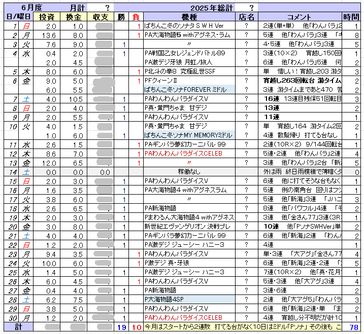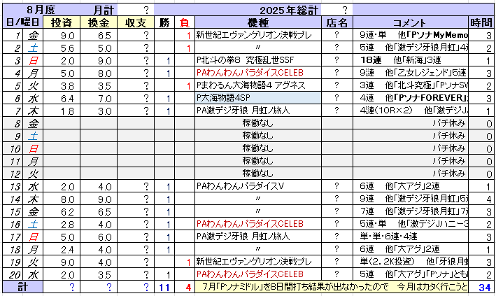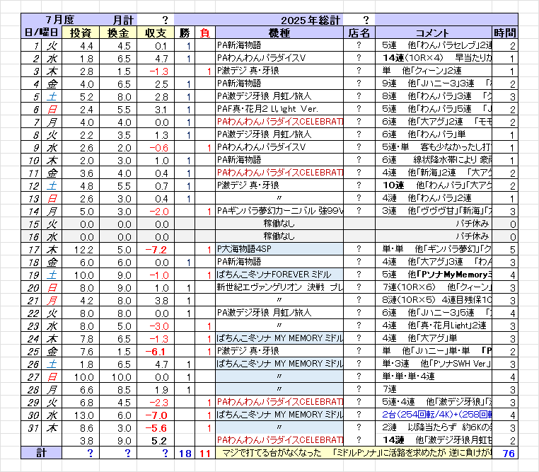 いつもの口癖ですが 店に行っても打てる台がありません! もう何か月も前からその状態が続いていて とうとう7月収支に至っては僅かではありますが 月収支がマイナスとなってしまいました あ~あ とはいえ今回は覚悟の上だったので それほどのショックはありませんでしたが とりあえず手持ちを拡げようとミドルに手を出して それが上手くいかなかったというのが原因です 折しもこの7月 初代から馴染みの「Pソナ」に先バレが搭載されて「PソナMyMemory」(以降「PソナMM」)として あちこちの店の4パチコーナーから1パチに配置転換された時期だったので 時は今 これに便乗しようと 思い切ってミドルにチャレンジ スタートさえズッコケなければ何とかなると7月の負けを覚悟で挑んでみたのですが それが?まさか? 暴走? いや違う でもみたいなもん? 甘の游タイム機でコツコツ溜めた僅かなプラス収支を侵食して月収支マイナスへ転落という流れ 以下の通り 興味のある方は計算してみて下さいということで7月後半からミドル機(機種名欄 青色塗りつぶし)にチャレンジしたわけですが 簡単にはフィットできませんでした まあ慣れてないのでしょうがないんですが 打ってみて分かったことは これまで打ってきた甘よりかちょっとは回るものの ボーダーを越える程でもなく それでも当機は 他のミドル機よりも店の扱いがマシだったので負け覚悟でチャレンジしてみたのですが ヒキ弱は何をやっても駄目これから毎月どれほどマイナス収支を重ねていくのか分かりませんが 時代の流れでもう1パチ游タイム機で勝ち続けることができなくなってしまったのは周知の通りです 店が勝てる台を用意してくれないんですから どれを打っても負ける 長い目で見ればね 業界自体がそういう方向にすすんでいっているので もう誰にも止められません あとはいつヤメるのか ヤメないのなら どれくらいの負け額まで許容できるのか その月の収支を常に念頭に置いてパチと対峙しなければならない いやマジな話そうですよ そうなりますでしょでは今回チャレンジしたミドル機「PソナMM」というのはどんな台だったのか あくまでも個人的解釈ですが 表にまとめてみましたので参考までにご覧下さい あまりつくり慣れてないので ちょっと分かり難いかもしれませんが こんなんでも3日くらいかかりましたから でも次回は 新データを代入するだけなので ちょっと楽になるかもしれません えっ次もやるん?? いやいやいや 次回も打てたらの話です つまり成り行き次第ということで でも8月はさらにキビしくなりそう 1パチもお盆休みの集客目当てで LT機を4パチから移動したりしてますから 手ぐすね引いて待ってます でもあんなもんイラネッ |'ω')ノ⌒゜ポイッ「PソナMM」レポート本機の最大の特徴は先バレ 初恋F(赤)を搭載したこと それも2種類(赤=信頼度約17%、白=信頼度約57%) 初見時はこれにかなり期待しましたが 打ってみたところ どちらも中途半端で使い難い いっそのこと先代の「Remenber」のカスタム仕様をそのままにして さらに先バレ 初恋F(赤)を追加してくれたらよかったのに そしたらユーザーのカスタム選択肢もぐーんと増えて歴代のPソナを越え おそらく最強Ver.になったと思うんだけど せっかくの先バレが役に立っていませんそんなこともあって 1パチコーナーでも人気はイマイチ よく空き台になっている いつでも打てる それと両隣の台もまた不人気で しかし ある意味これは好都合 一人ひっそりのんびり打てる てこれ最高のお・も・て・な・し (てちょっと古いか?)じゃないですか そこんとこだけはサイコ~なんだけど それで勝てればね しかし 現実は僅か8日の実戦で1万9千円のマイナス て これはイタいぞ ミドルとはいえこれはイタい 毎回負けてるような気がする? てか負けてますけど差玉をご覧あれ 赤字ばっかりでしょ この台 ハズレ方もハッキリしていて 初恋F(赤)をONにすると 大当たり占有率が90%になるので 鳴らなきゃハズレと思っていい つまり保留が点灯した瞬間 初恋F(赤)が鳴らなければほぼハズレという? なので8個点灯していても すでに判定済みなので 全てハズレです 極端な話じゃいっそのこと初恋Fを切るか or (白)にしたら? て思うけど そうなると今度はかったるいんだよね 用もないのに「チュンサン!」とか呼び止められて6回のうち5回はハズレですから 夜空でユジン待ちなんて 冬ソナ好きで カネとヒマのある人向きの子供騙しの演出でしかない みんな騙されている 誰が突引いてわくドキするんですか どうせ次は通でチャンチャン♪でしょ? 突からの実質単 そんな流れが目に浮かびます じゃどしたらいいんだろ?? 負け捲った末に考えましたよ あのね 初恋F(赤)の゛入賞即ハズレ告知機能? ゛を利用して保留MAX打ちしたらいい 最近はどこの店でもヘソは最小 寄りヨロイも狭いため 球の勢いも弱く 回りムラも生じ易いです なのにそこで保4止めしたら せっかく台が上ムラ上機嫌状態にあるのに その勢いを止めてしまうでしょ 下ムラ