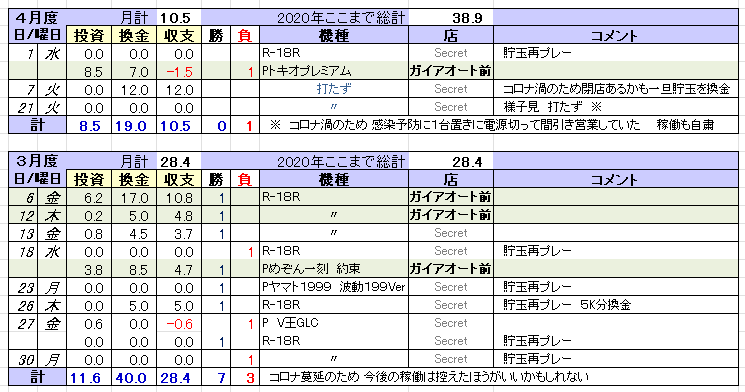 2月、3月のマイナス収支を少しでも補填できるよう心掛けたつもりでしたが この4月 最後の最後にやらかしてしまいました 28日に-10K 何でそんなことになってしまったのか 普段から気を付けているつもりなんですが 魔が差したというか 月に一、二度そういうことがある 月のものが えっ月のもの? て違うよ そういうんじゃない 4月28日 午後2時前に入店 相変わらず打てそうな台もなく たまにはこんな台でもと座ったのが「ヱヴァ咆哮プレミアム」甘ライトで游タイムはなし 最初の1Kで@71回ったので こりゃイケるかもと思ったが 追い金1Kしたところで@60とガックリ落ちてしまいヤメ 最初のは上ムラだったみたい次に「大アグ」(91回転~) これは昨日打った台でフツーに回る しかし投資1.4Kで当たるも単 その後は回りが落ちてしまい 追い金0.8Kしたところでヤメ 宵越しに期待してもう1台(0回/83回転~)打ったが クッソ回らず 次は旧「パワフル」を打ち 投資1.2Kで5連して出球計 2,762個 総投資5.6Kなので差球は -2,838個と結構なマイナスとなってしまったが それでもこれがこの日のピークだった次は「ギンパラ甘」(139回転~) 0.6Kで当たるもSTスルー 出球計 3,165個 総投資6Kなので差球-2,835個 今思えば ここいら辺がヤメ時だったのかもしれない よりによってまた「パワフル」(8回当り/57回転~)に手を出すなんて これは青田買い それでも当たってくれれば まっしょうがない さて帰ろうかと諦めもつくが まさかの游タイム当たらずのスルー誰がこんなことを予想できようか 「クィーン」でもたまにあるけど サポ100回転はよくスルーする よくするからするー てしゃれじゃないよ まあしょうがないって言えばそうなんだけど-10Kはイタかった おかげで4月20数日間 ここまでセコパチで積み上げてきたプラス収支の大半を失う羽目にならば残り2日は打たないほうがいい 絶対に勝てる自信がないのなら そうだ ステイホームしよう 2か月連続のマイナスをやらかしてしまった今 僅かなプラスでもいいから逃げ切りたい 連敗を止めたい またちっちぇーことをと思うかもしれないが 今はそういう状況なのでしょうがないんだ 5月1日(木) 午後2時過ぎに入店 本日のベスト台は「大アグ」(159回転~)か 最早こんなんしかない この台は昨日ちょこっと打ってみて 何とか打てそうだったので といってもボーダー以下だが 0.8K/42回転目に当り2連 出球は1,147個 今GWの真っ最中だが 5月初日とあってどうしても勝ちたい 勝って弾みをつけたい 初っ端から負けるとゲンが悪いので何としても ならばここでヤメるのもアリか? いやまたちっちぇことをって言うかもしれないが そんなこと言う奴は 現実が分ってない どんだけ打てる台に飢えていると思っているんだと1台出てきた!? 「新海」(219回転~) これはイイww イイでしょ♪ めったにお目に掛かれない 200越えなんて 早速打ってみると 投資0.4K/23回転目に早当たりして6連て マジっすか! いつもは早当たりしても単 下手すると游タイム突入して単ということも いやそんなの日常茶飯事 もう慣れっこになってしまったが こういう展開もたまにはあっていい(下記データ) この後またチョーシこいて 甘1台打って 単で持ち玉減らしてザマアになってしまったが それでも初日にしては上出来 よくやった! いいスタートが切れたぞ総投資 1,400円総出玉 4,036個差 玉 +2,636個 くりっくよろしゅうおたのもうします