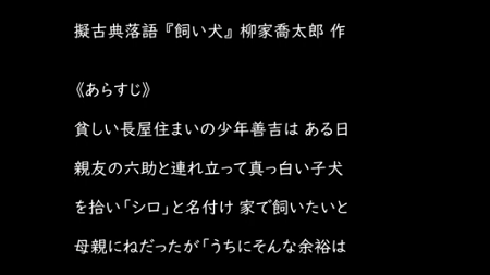 泣けます! めちゃめちゃ泣けます 。:゚(。ノω\。)゚・。↓↓↓《ストーリー》善吉少年と捨て犬シロ そして悪に染まり 道を踏み外してしまった幼馴染みの六助 それから善吉が兄妹同様に育ててもらった大店の 一人娘のお嬢さんまで 同じ年頃の三人が紡いできた10年間の人生模様 その中心にはいつもシロがいた 一匹の子犬がしっかりみんなの心を繋いでいてくれた ありがとねシロ でも もう会えないかもしれない・・・【擬古典落語】ぎこてんらくご江戸時代や明治時代を舞台にした古典落語風の新作落語【天水桶】てんすいおけ江戸時代 主に防火用水として雨水を貯めておく大きな桶【行く方知れず】ゆくかたしれず行方不明 《犬は大好きだけど 落語はよく分からないし 聴くのも面倒で・・・という方のために》若い人たちにはそういう傾向があるようですが 今回は話の前半を粗筋として5分に 肝心のラスト14分を動画で というスタイルでまとめてみました 実験的な試みですが これで少しでも落語ファンのすそ野が若い方のほうにも広がって行ってくれたらと思いまして《どこ推しかと聞かれたら? 一も二もなく犬の演技でしょう♪》シロは何もしゃべりません それでも鳴いて吠えて噛みついて 表情をいろいろ変化させて感情表現しています 初期の頃は 舌を出してはあはあと息づかいも荒く犬独特の表情もありましたけど そこもちょっとやって欲しかった おそらく落語界で犬をやらせたら一番ではないかと 犬の喬太郎か 喬太郎の犬かと 言われるくらい 間違いありません 《時代設定がよかった》おそらく江戸末期か明治初期頃かと思われますが 現代劇となると今はSNSなども盛んなので「で注射は?登録は?」と要らぬ心配をしなくちゃならない どうしてもそこが気になって話が頭に入っていかないなんていう人がいるかもしれませんが これこそが擬古典落語の真骨頂で 遠い昔の話なんだなと思えば気楽に耳を傾けられますから 《擬古典から古典へ》よく新作落語は 時代に合わなくなると捨てられてしまうと言われますが この作品の初演は10年くらい前でしょうか タイトルも内容もちょっとずつ変えていっているようですが いつの日かこの噺が 擬古典から「古典」へと呼ばれる日が来たらいいなと思います こんなに素敵な擬古典落語は今まで聴いたことがありませんから お体の調子もあまりよくないようですが その日が来るまで喬太郎師匠には頑張って頂きたい・・・↓↓ ウクレレやってますにほんブログ村