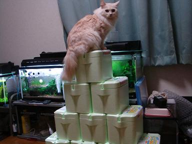 ビーシュリンプのブログの登竜門?である、「ランチュウ」が届きました。その前に、水槽の準備。適当なのがなかったので、近所のホームセンターからプラスチックの衣類入れと e~ROKA なるもの購入して、ウチの金魚の水と、水道水を混ぜて、回しておきました。カラカラカラカラーっとその前に「こんなん設備でいいのかー」、と送ってくれた方も、これを見て卒倒しているかもしれません。あと数が多いので、前からある60センチ水槽の流金・出目金・東錦の連合水槽にも少し入れます。なんとなんと遠く、富山県から、はるばる、岩手まで、黒猫ちゃんが運んできてくれたとです。実は以前にビーシュリンプを購入していただいた方で、ひょんなことから、ランチュウの話になり、 「あげましょうか?」「いただきますよ」てなことで、今回、私用に選別して送っていただきました。これまたすんごいデカイ箱で届きまして、先方様も、初出荷で心配だったようですがなんとなんと、死着0生かすも★すも、私の腕次第ときたもんだ。wwwプレッシャー死着0なので、ランチュウ、ビッダで出品してもですよ。水合わせの現場に皆様に立ち会ってもらっています。13匹くらいかな?今1時間くらいなので、あともう少し経ったら、例のプラケースに移動させます。なにせ未経験の領域なので、なるべく★にしたくないのですが、金魚って以外に水に慣れるまで、難しいんですよねー。それともう1つ大イベントが。このホウレンソウなどを、ブログ会の駄洒落の帝王warasyandoさんにあげるためと、今後のビーシュリンプを守る会設立のため(ホントか~たかたー)会合を20分ほど近くのホームセンターにて会議と取引をしてきました。いつもながら気さくなwarasyandoさんでした。今日は1週間ぶりくらいで、たかた産ホウレンソウの試食タイムでした。老いも若きも集まってきます。困ったときの万能餌です。