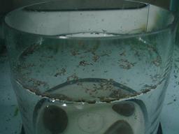 水温がやっと20度前後に安定したのを見計らって次男がカブトエビの卵を種付け?しました。以前にwarasyandoさんからいただいてたモノなのですがセットなので全てキットは揃ってあります。ただしカルキ抜きは使用不可ということで、ビーの水を使用しました。もしかしてビーよりもデリケートなのかもしれません。卵を捕って乾燥させるとまた繁殖できるらしいです。先週立ち上げました30キューブにて行方不明になっていたホシクサがソイルをほじくっていたらヒョッコリと出現しました。向かって左側の方ですよ。1軍45cm水槽には私の専属水草スタイリストであります、warasyandoさん作成の各種モスが侘び寂びのある水景を演出してくれてます。2年物もありまして大分伸びております。人のふんどしを借りてなのですがお気に入りです。やはりモスはビーたちの揺り篭ですねー。ここからは気持ちの弱い外は絶対に覗いてはいけません。1軍水槽のソイル内に未確認生物がいました。ちょっとでかいんですよ。ていうか正体は分かるんですけど・・・ミミズですよね、れっきとした。水中に対応できる種類なんでしょうね。コヤツの小さいのが流木の下にくっついているのは見ていましたがこんなにでかくなるとは思ってませんでした。透明なミズミミズとは別の種類です。気持ち悪いのでピンセットでつまみあげてランブアイ水槽へ入れましたが、みんな怖がって突っついては吐き出していましたがしばらくすると誰かが食べたのかその姿は無くなっていました。畑だったら別にびっくりしないんですけどね。水槽で見つけたらちょっとキモイです。