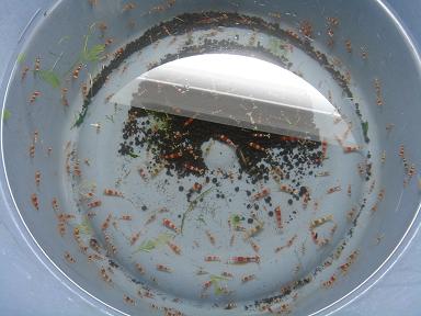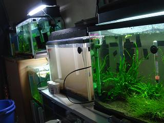 ビーとGIのF1ある意味楽しみでしたが、やはり綺麗とはお世辞にもいえませんので、GIを現在引越しさせている最中です。やはり純血を守りたいもので。この水草専用水槽が引っ越し先です。この水槽、悲しいことにハジにあるのであまり観察できません。このままGI事業を継続させるか、撤退させるかはたまたinufuku社と 提携するかこのエビには悩みます。うちのビーはたかたオヤジと違って、流線型です。かなり水の抵抗が少ないと見ました。今度スピード社に売込みしてみようかな。