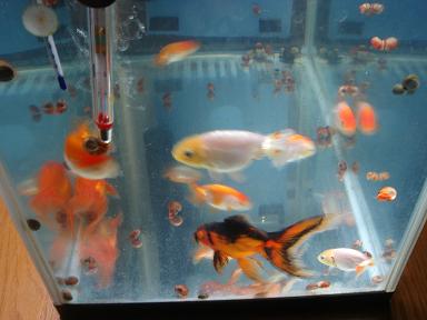 今夏皆様は順調なアクアライフを過ごされましたでしょうか。私目におきましては、厳しい夏でした。暑さよりもいい水が来ない!そしてこの話は、他の方も同じでした。自宅から歩いて1分のところにんなやら怪しくプラ舟をたくさん小屋に置いている家がありまして、今日思い切って、アクションンを起しました。たかた「こんばんはー私たかたと言います、 いったいyouは何を飼ってるんでございますか?」ハス向かいの隣人 「OHランチュウでごさるよ!」そこにはうちよりはるかにでかい宇野系ランチュウが40匹前後はいるではあーりませんか。プラ舟はざっと6個くらい、水は60水槽に5個くらいはエアを通して、作っておりましたよ。そして、その中で「今年はいい水が出来ない、普段は2ヶ月でできるのに全然、エサをたべてくれないんだ、Mrたかた困ったよ」トボトボ。「あーっやぱり、うちも今年の夏は全然なんですよMr爛忠男さん(仮名)」などなど会話は弾みはじめてのセッションで、20分くらい話し込んできました。今度我家にも見に来たいと言っておりましたよ。うちの子供ランチュウ(宇野系)プラス出目金毎年富山の〇●さんから頂いております。30キューブ、何故か一番調子がいい。サブの45水草用でしたが、現在避難的に、GIと1軍が仲良くお住まいです。混ざらないことを切に願います。m(__)m
