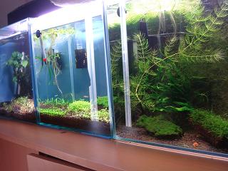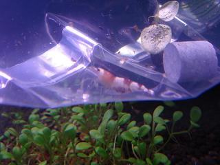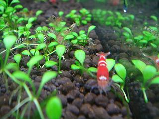 抱卵しても稚エビが増えないという悩みにぶち当たるのはプロのブリーダーでもあるのかと思います。そんな時にいろいろなブロガーさんの経験談の中に出てくる話が「水草の効能」。有害なアンモニアを硝酸塩まで代謝するまでにバクテリアのお世話になったり、水草が根や葉から吸収してくれることも大切みたいですね。私の場合は主に水草は稚ビーの「揺り篭」としての役割の方が大きいです。ちなみに手前のワンサカ生い茂っている水草(名前は不明、別に知らなくて良しとします)は良く増えるので水質浄化にも強い味方になっていますし、稚ビーの良い隠れ家となっています。モスももちろん隠れ家やエサにはなりますが光合成が盛んではないと思われますので、隠れ家としての役割と捉えるべきでしょうね。ちなみに私はno2やno3を効率よく排出したいため、週1で1リットル程度底砂の掃除と水換をしているので、それほど水草の浄化作用は必要としていないかもしれません。しかし、底面フィルターで水換をせず足し水のみの方には水草の浄化作用は不可欠なのではないかと思います。いい水を作ると簡単には言えるのですが、ソイルや微生物、水、ろ材、全てのバランスがうまく回らないとビーの調子は上がってこない。まさに負のスパイラルに陥ると泣きたくなりますけどエビを見ていると癒されるのでまた繁殖に向けて頑張りたくなるのがアクアリストの性ですよね。今日はinufukuさんからいただいた麦飯石をGI水槽へ投入しました。これで上手くいけばソイルと違いリセットの必要が無いので楽だなぁ全体のレイアウトはこんな感じ、いたって簡単な水草で構成されております。ボルビってなかなか流木に活着しないですね。