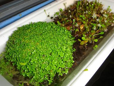 夏に屋外に置いていた2つの水草秋になり枯れかかってきたので、強力な32W蛍光灯×2の元に置くこと約1週間、見事復活してきました。でも電気代がもったいないので日照時間は5時間程度です。「九場羽゜ァ流」の頭頂部は黄緑だったのですがこの通り。奥の「黒゛ッ素」らは秋まで放っておいたのでキノコが・・・。と思ったら可憐な花でした。30キューブ水槽×3の蛍光灯下に置いているだけなので勝手に復活してます。これはぴぴさんとこの同じでしょうか?それとも穴借巣warasyandoさん作付礼燃巣赤VS黒チョビヒゲダメオヤジ(出目金の成れの果て)
