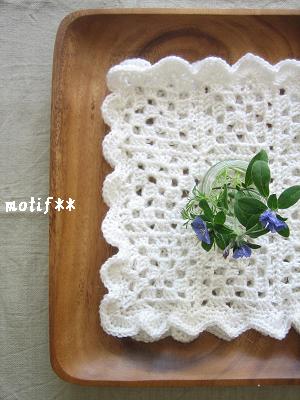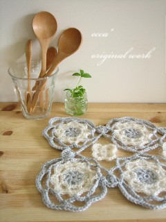 昨日のモチーフが編みあがったのでつなぎ合わせてテーブルマットを作りました。from 【ecca* natural】モチーフを編んだのは、実は今回が初めて。なので、つなぎ合わせるのも初めて・・・でちょこっと失敗(>Д