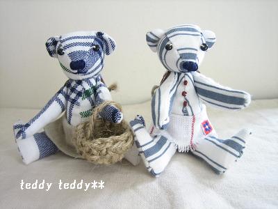このあいだのteddyの兄弟ができました^^右のしましまがそうなんですが・・・旦那samaにも言われたけど『ぶさいく』鼻の所を尖らせるように意識したのですがそうすると長くなりすぎて、アリクイみたいになってしまいました(笑)参考にしたきっかけ本シリーズの『小さなテディベア』294yenですがとても分かりやすく、私でも簡単に作れました^^そして、ついでにjuteで編んだshopping basket**ここまで来ると、紙粘土でパンや玉ねぎを作りたい気分です(笑)Le cruiset【40%off】sale、やっぱり人気ですネ**1つは欲しいと思っているのですが・・・新色を見ていると黄色のココットロンドがやはりかわいいデス。【 ⇒新色最安値search 】4CUPS-sanでは、入荷したてなのにAnniel Sports のブーツが既に残り少なくなってます・・・素朴でシンプルな所が、人気なんですネ。⇒Anniel Sportssearch2458(MARRONE)の色が、きれいで気になっています。旦那sama無事に日曜日帰ってきました^^昨日は1日お休みをもらっていたので、ゆっくり家で過ごしました。私は鍋つかみを仕上げお土産に曲げわっぱをもらいました^^from 【ecca* natural】今日は久々の出勤できっと疲れて帰って来るはず・・・帰りは早いカナ~**HOME商品入れ替えました♪良かったら覗いていってください**