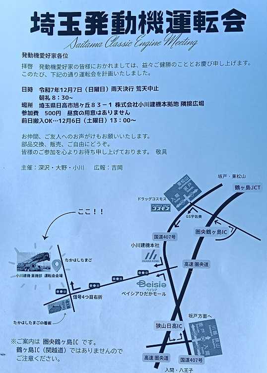 ブログにレポ数件有り、 こちらにも写真多数。 新府城の紅葉最高、ノンビリ回してた。参加約75名、過去最高だそうだ、弁当は50個注文してあったが大急ぎで追加したそうだ。12月7日の埼玉発動機運転会案内は特に力入ってた、凄い規模の運転会になるかも、屋台?もでるそうだ。12月7日は埼玉でオールジャパンミニカーのイベントもある二つハシゴしようと計画してたら都合が入り7日は動けない。公式HPはこちらに。