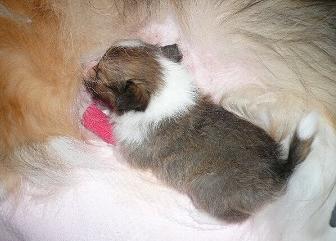 朝、おっぱいを飲む様子です。昨日の手術中、『輸血するのでお母さん連れてきてください』と連絡があり急いでレベッカを連れ病院へ。危ない状態なの?心臓どきどき吐きそうなくらい気持ち悪くなり・・・。病院に着くと先生がレベッカを待っていました。『仔犬ちゃん大丈夫ですよ』ホッと力が抜けました。手術が終わり、先生から説明を聞きました。お腹の外だけでなく中もあまりよくない状態だったようです。早く手術してよかったです。少しの出血でもこの子の大きさからしたら危険なのでレベッカから輸血しました。落ち着くまで獣医さんで様子を見てから帰ることにしました。術後でもうろうとしている中でもヨチヨチ私の手のところに来て・・・。こんなに小さいのにホントよく頑張った~。ママからもパワーをもらったので大丈夫!帰ってきてから少しのミルクを飲み、この子にしたら大手術やはり辛いのでしょうね。手の中で寝たがるので眠れるように横についていたら手を枕にして一晩寝てました。朝はだんだんリラックスした寝方になったので少し安心。しばらく油断できませんが、きっとこの子は頑張るはず!