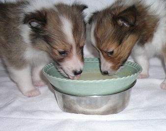 女の子・男の子男の子。今日、手術する事に決めました。朝、病院に行く前に離乳食を食べているところ。本来、手術前は絶食なのですが、この時期の仔犬に絶食は無理なので少しだけ食べて行きました。この子は生まれた時に仮死状態でお腹に穴が開いていてその治療をしていました。腹膜炎などの危険もありました。産まれたときから注射や薬。一日2回の消毒。嫌がって泣いて泣いて可哀想だけど私がやるしかない! お腹が痛くてうつ伏せで寝れない日もあり泣いて寝ないので一晩中抱いていることもありました。生後30日、ここまで頑張ってくれました。ホント、よく生きてくれた・・・。もう少し大きくなってからと思っていましたが手術で穴が綺麗に塞がれば、痛い消毒からも解放されるし、まずい薬も飲まなくていいし。これから遊びたい時期になるので、早くできるのであれば!いろいろ話し合いながら院長先生の”この大きさになれば大丈夫。”という言葉を信じて金曜日の治療の時に決めました。昨日から『ボク頑張る!』というように食欲が出て離乳食をパクパク食べるようになりました。病院でシェルティの先輩ブリーダーさんに会いました。昨日産まれた仔犬が具合悪いようで酸素室で点滴に付き添ってマッサージしていました。隣同士、仔犬に声をかけながら”お互い頑張りましょうね”と言ってくださいました。仔犬を取り上げているといろいろな事があります。みんなが健康な状態で生まれてくるわけではありません。私はどんな状態で産まれてきてもできる限り事をしてあげたいです。今、お留守番の子犬たちが心配なので一度戻ってきました。夜、迎えに行く予定です。心配で落ち込みそうですが、帰ってきたら落ち込んでる暇はありませんでした・・・。プールで浸かるベリー。気持ち良さそう~
