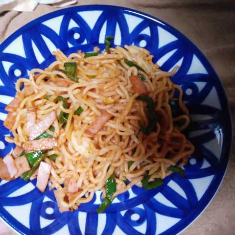 具材はピーマンとスライスハム。細かく切って油で炒め、麺をほぐしながら炒め、最後に火を止め粉末のトマトソースを混ぜて完成です。