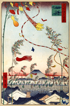 更新がもう滞ってる・・・。がんばれ~!!暑いですね~。お江戸の長屋なら八っさん熊さんが、縁台を持ち出し茶碗と貧乏どっくり片手に、一杯やりながら暑さをぼやいてる景色が、蚊遣りの煙の向こうに見えそうな感じです。明日は、七夕祭りですね。願い事をかいた短冊を竹につるし飾ったりしていますか?「七夕」は本来、「棚機」や「棚幡」(読みは共に「たなばた」)といわれ、お盆の行事の一環として行われていたとのことです。7日の夕方に、霊前に棚をつくり幡をまつったことから「七夕」とかいて「たなばた」と読むようになったようです。幡をまつる換わりに短冊に願い事を書いて、ご先祖様にお祈りをしたのが、もともとの姿なのでしょうね。織り姫と彦星のお話は、どこかのロマンチストが考えたすてきな伝説ということでしょうか?旧暦の7月7日(新暦の8月7日かな?)は、梅雨も明けて夏の夜空にキラキラ星がかがやいて、そんなこと事を思う人がいても不思議ではないかもしれませんね。