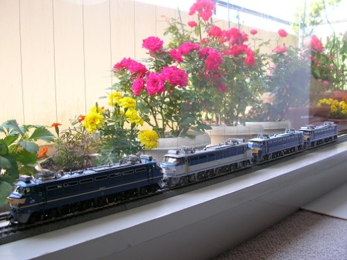 電気機関車のご紹介は一旦中休みさせていただき、今日はベランダに咲いたバラをバックに好きなJR貨物の66を並べてみました。まずは4重連。機関車はこれまでにも何度となく登場させていただいたものばかりです。ムサシノ製国鉄2次クーラー付。左はムサシノ製、右はトミックス製(一部改造)。左はトミックス製(一部改造)、右はムサシノ製。ムサシノ製JRF新更新車54号機(クーラー付)。そして、今度は機関区に並ぶ4台。ムサシノ製国鉄2次37号機(クーラー付)。ムサシノ製2次JRF更新車30号機(クーラー付)。2台並んだムサシノ製66貨物機。左はトミックス製前期JRF新更新10号機、右はムサシノ製2次JRF新更新54号機(クーラー付)。にほんブログ村
