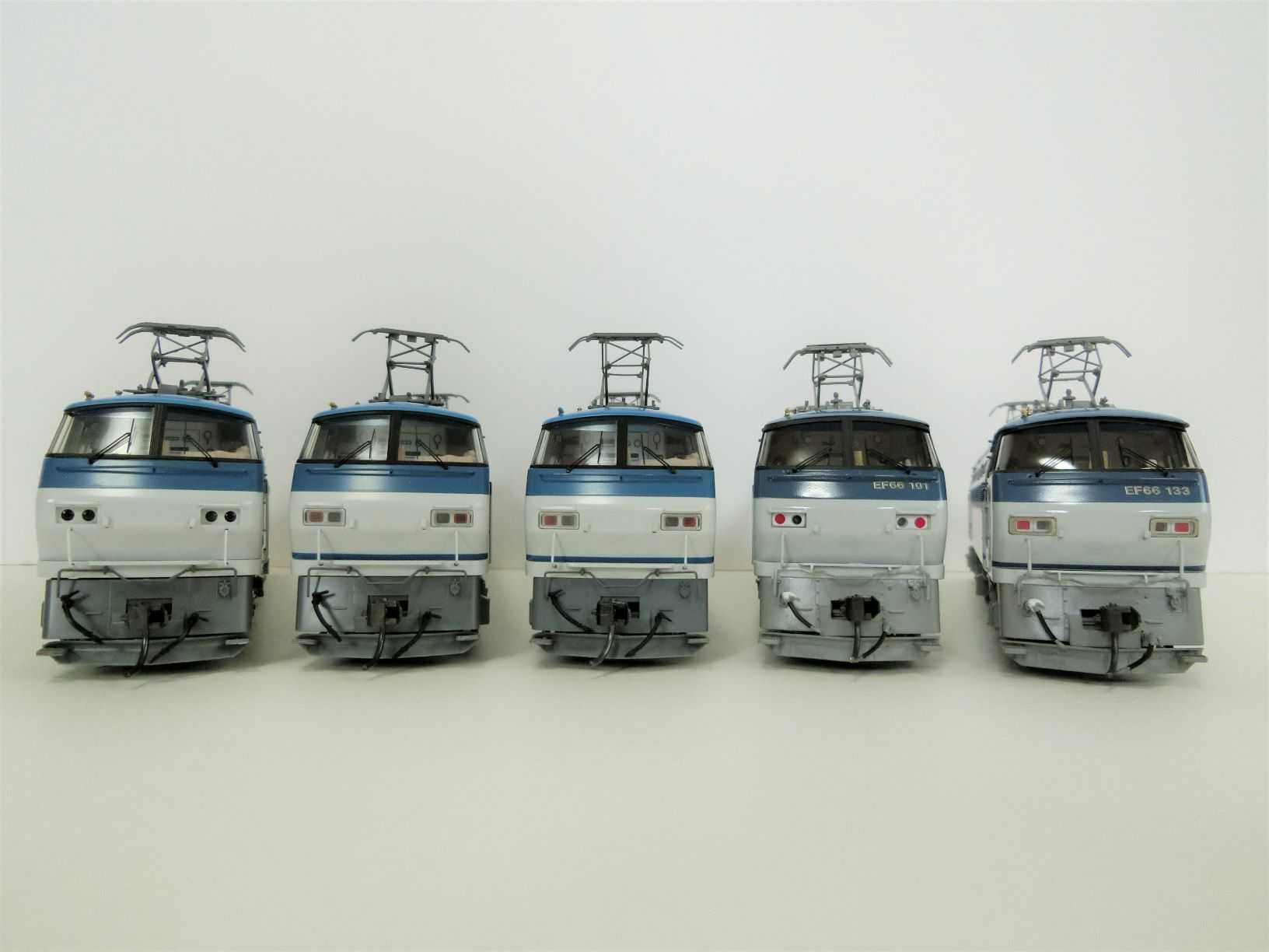 ブログ村で65の日を見るたびに明日は66の日かと思います。なぜか65の日に65を並べることは今までありませんでしたが、66の日に66を並べるのは今回で3年連続になります。これも無類の66好きだからかもしれません。一昨年は2台の66を並べ、昨年は11台の66を並べました。そして今年は100番台を並べることにしました。はじめて66を知ったのは何と本物ではなく、カツミの66からでした。その頃はまだ、下関の鮮魚などを運ぶ貨物列車の牽引機で、屋根の庇もなかった時代です。そんな機関車が一躍ブルトレの先頭に立ったころには大好きな機関車になっていました。そして29年前に一度だけですが、家内と二人で66牽引の「あさかぜ」に乗りました。興奮のあまり、東京から広島まで一睡もできなかったことを覚えています。模型ではカツミから始まり、エンドウや天賞堂を渡り歩き、今残っているのはトミックスとムサシノモデルになりました。一時は15台を所有していましたが、昨年は11台、そのあとトミックス0番台特急牽引機PSと100番台後期型PSが加わり13台の勢力です。ではご覧ください。下の画面、左から3台はトミックス、右2台がムサシノモデル。左から前期型PS加工、後期型PS、後期型(屋根ブルー)PS、1次型、3~5次型。下はトミックス3台。下はムサシノモデルの2台。今思うとエンドウの100番台2台も転属させずに残しておけば良かったと後悔先に立たずです。皆さんも何事につけ、後悔の無いよう事前に熟慮されることをお勧めします。にほんブログ村