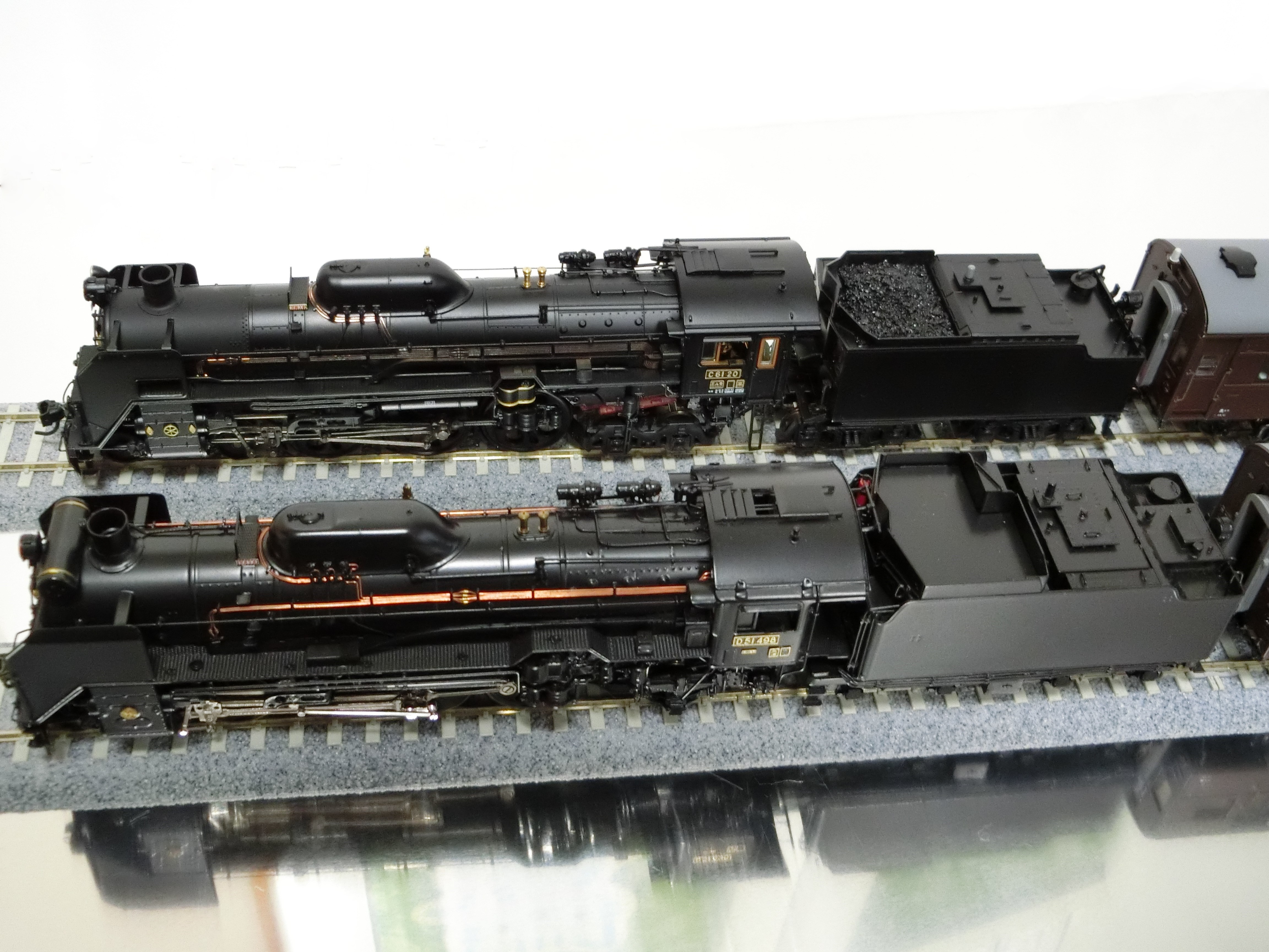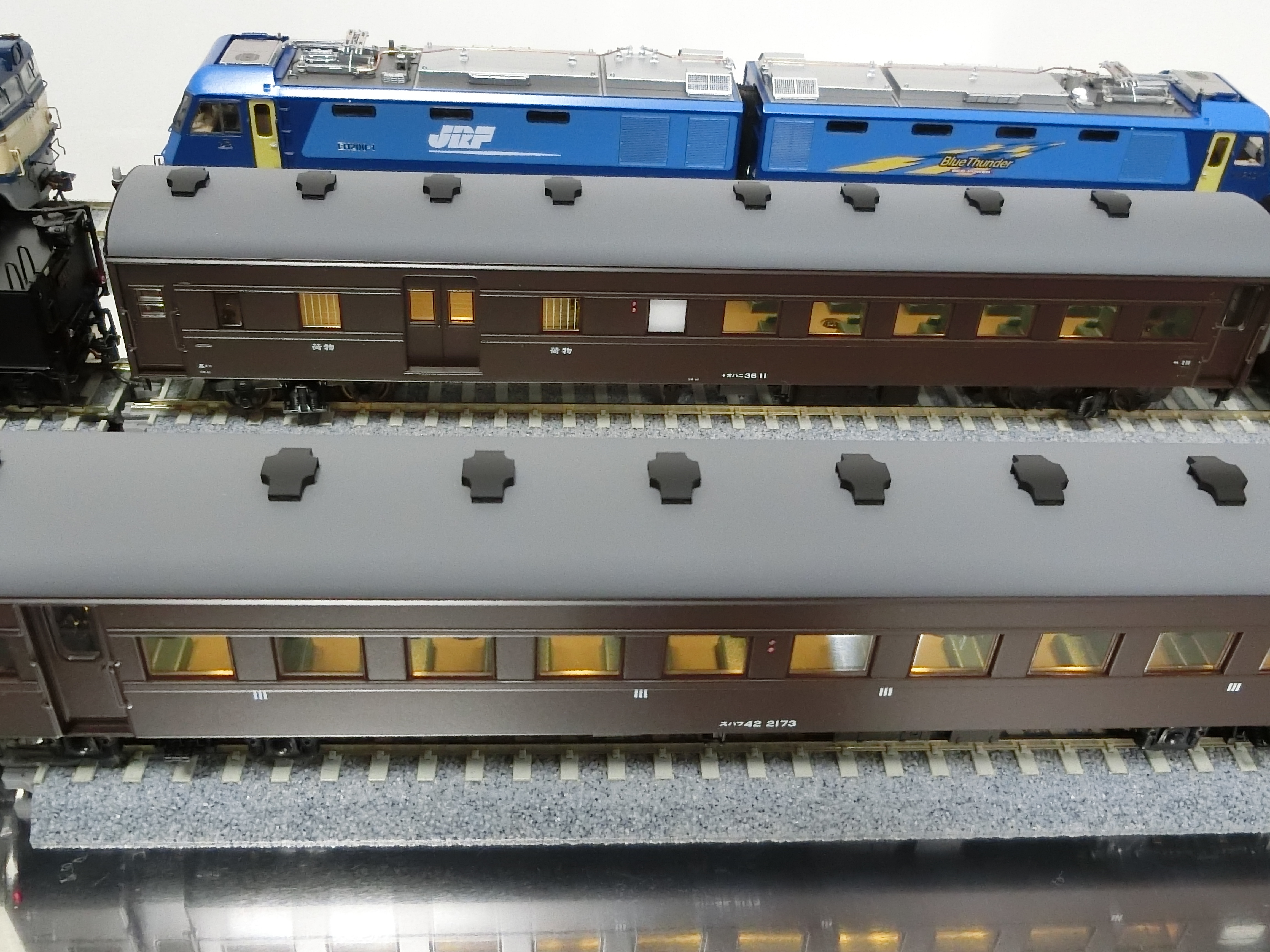機関車は手前から真鍮製D51-498、中にカンタムC61-20JR東日本、奥は真鍮製EF60、いずれも天賞堂製。右奥に真鍮製EH200-1ムサシノモデル製。