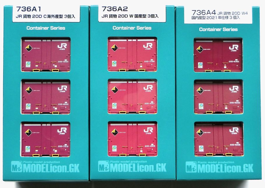 左から736A1 JRF20D C海外産型、736A2 JRF20D W国産型、736A4 JRF20D W4国内産型2021年仕様で、一番右の2021年仕様は側面上部の白帯が中央で省略されています。