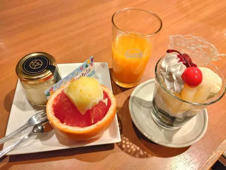 ↓ 左からプリン、グレープフルーツと柚子アイス、オレンジジュース、ミニパフェ