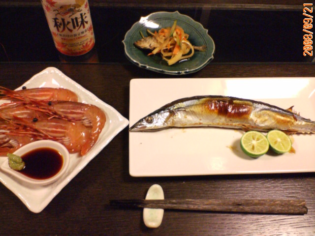 昨日のホームパーティで出した秋刀魚。半分食べたけど、焼き立てでは食べられなかったので、今日は丸ごと一匹焼きました。焼き立てに酢橘を搾って熱々のホクホクをいただきました。お供は昨日の残りのボタン海老と小鯵の南蛮漬け。そしてビールです。はい、この通り。綺麗に美味しくいただきました♪ご馳走様でした~!