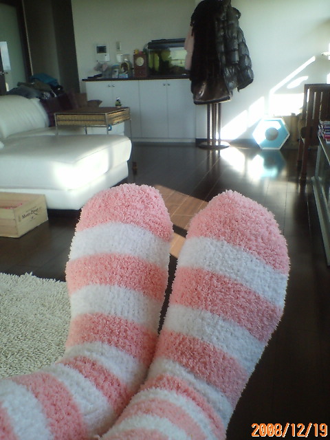 最近あちこちのショップでよく見かける「ふわもこソックス」 ついに買っちゃいました♪ リビングの半分に床暖房が入っているとはいえ、やはりそれ以外の床を素足で歩くのは寒いわけで、普通に靴下を履いていても洗面所の大理石の床は歯磨きをする時間だけで十分ヒエヒエになるわけで。 で、このふわもこソックスを買ったわけですが、これいいわぁ~♪ なんといっても肌触りがめっちゃいいっ! しかも暖かいっ! ずれない程度にしっかりしてるのに、締め付け感もないっ! このままベッドに入っても大丈夫なんじゃないかしら? ということで、お勧めです☆ おまけで私の近況を少し。 来年早々からのライターのお仕事のために、商品知識を入れたりライターとしての勉強をしたりで慌しく過ごしています。 明日はライター講座も受講する予定。 夜は電撃ネットワークが出演するイベントがあって、南部さんにお誘いをいただいているので出かけるつもりにしてるけど、電撃の出番はなんと深夜の2時から。 その後も一緒に飲むとなると朝までコースは決定的。 翌日は午後からFM千里の収録&忘年会があるのでちょっと迷い中^^; 離婚裁判の方は進行状態が少し後退してます。 少し前にお知らせしたように、相手側が担当弁護士を変更したおかげで当初のスケジュールが大きく崩れてしまいました。 1ヶ月前には年内に一応終わりを迎える予定だったのに、最低でも来年の3月までは終わらないことが決定。 離婚成立後の生活のためにすでに動き出しているので正直言ってちょっと凹んじゃいましたが、親や友人に励ましてもらって無事に復活いたしました。 決まってしまったことをいつまでも嘆いていても仕方ないので、今の状況でできることをキッチリやっていかなきゃね。 不況で職を失ったり収入が減る人がたくさんいる中、私はありがたいことに新しい仲間と仕事を与えてもらえてるし、今のところ住むところにも食べるものにも困っていないし、イタズラには泣かされることもあるけど可愛いえいきちはそばにいるし、なによりもたくさんの素敵な仲間や友人が応援してくれているし。 少しくらい嫌なことや辛いこともないとバチが当たっちゃうよね。 ということで、今日も1日頑張りますっ!