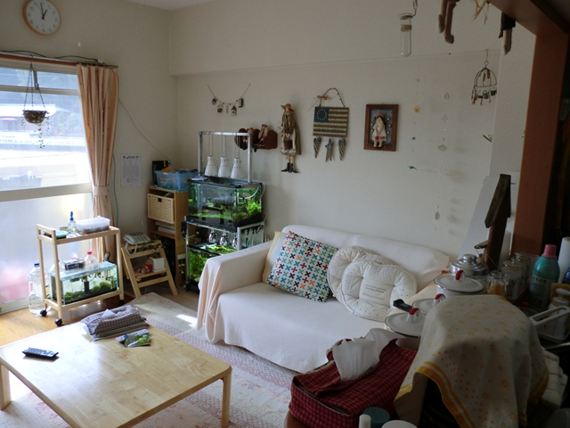 こんばんは、eitaroです。今日は、何を書こうかなと思い考えましたが、これといったネタがありませんでした。こういうときは、水槽ネタをやめて、とも考えましたが、水槽のレイアウトについて書こうと思います。ダイニング 8畳の一角、約1畳を占拠しています。水槽は、60×30×36cm 2本 、 45×20×22cm 1本 です。配置は、こんな感じです。60cmを鉄製の台に載せ、横のカラーボックス改に外部フィルターを入れています。テトラ EX-75 と エーハイム500です。周囲のまとまりもなく、ホースとかで見た目も悪くなっています。本日、嫁さんに水槽台 120cmを提案しましたら、あっさりOKが出ました。しかしながら、水槽台を換えるということは、水槽もリセットかなと思い、今回のリセットでは、見送ることにしました。将来的に、120cm水槽台の上に60cm水槽×2本(120cm水槽×1本?)でフィルター類を中に入れて見えないようにしたいな と思っています。あくまでも理想です。お金と機嫌次第だと思います。今夜は、この辺で、eitaro。 よろポチです。にほんブログ村