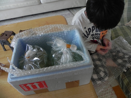 こんばんは、eitaroです。 本日は、200hiaceさんから、赤ビーを送付していただいたのでその記事を! 朝9:00ごろ、クロネコさんが、届けてくれました。最近、ハンコとか、サインを求めてきません。回数が多いからでしょうか?クロネコメンバーズになったからなのでしょうか?いづれにしても手間が省けて、こちらも助かります。 子供と一緒に開梱したのですが、子供は、エビよりもプチプチに興味があるようで、すぐにプチプチし始めました。エビには、目もくれません。 私は、水合わせするため、サテライトを準備し、サテライトにたくさん入っている袋を投入。抱卵も1匹入っているようで、うれしくなりました。 もうひとつの袋は、容器を水槽に浮かべ、少しずつ、水槽の水を足して、水合わせをしました。どちらも、朝から、6時間ほど水合わせに時間をかけました。 水槽に投入後、赤ビーの柄を見ると、ハイグレードなものまでいます。ありがとうございます。200hiaceさん。 リシアの上がにぎやかになりました。と思っていたら、30分ほどで、すべてが裏の水草に隠れてしまい、1匹も見えなくなりました。2~3日すれば出てくるかなぁ???ありがとうございます。200hiaceさん。大事に増やします。(笑) つぎに、本日は、上水槽リセットに向け、清掃を行いました。また、荷物(水槽関係)が会社へ届いていたので取りに行ってきました。買ったものは? アマゾネスさんでマスターソイルHG 8Lとスーパーバイコム21PDとエビ掬い用のネットです。商品代金+代引き+送料で、3800円。 続いて、チャームさんですが、少し今回は、不満があります。ツインブリラントフィルターが639円で爆安だったのでオーダーをしようとしましたが売り切れであきらめて、ツインブリラントスーパーフィルター1040円を購入しました。翌日、見るとツインブリラントフィルターが639円が復活していました。入荷したの?する予定なら、オーダー受け付けてよ。という気持ちでした。それと今回、200hiaceさんお勧めのマルチ水温計。水心のエアーポンプ、チューブなどなどを購入。5440円也。ポイントでの買い物です。気持ちいいですね。ただみたいで、でもそれ以上にお金使っているかも...。 本日、立ち上げ準備まで行い、明日、立ち上げを実施しようと思います。明日の更新をお楽しみに! eitaroでした。 にほんブログ村