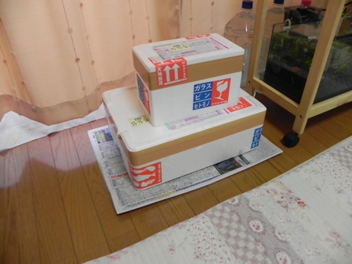 こんばんは、eitaroです。土曜日に見てはいけない、ヤフオクを見ました。最初、「えび屋」さんのえびを入札しようとがんばりましたが、諭吉さんオーバーで断念。その後、少し小さい安いシャドーを見つけ、入札しました。2つほど同時に入札をして待っていると、またまた、両方とも落札してしまいました。前にもこんなことあったような...???オークション下手ですね、わたし。エーハイム2215落札がこれまでで最高の落札の仕方でした。ですよねぇそれぞれ別の方の落札となり、手間と時間とお金を要しました。支払い能力は今ありませんが、かんたん決済でカードを使用。事後報告でしかられることにしました。 本日、到着したのですが 、事前にいいわけをしましたが、嫁さんは少しあきれていたようです。出世払いの約束をしました。帰ってみると、発泡箱が2つ。 それぞれ、1匹なのですが、下の箱は大きすぎます。大げさです。 水合わせ中に写真を撮りました。まず、ブラックシャドー 7号 次に、シャドーパンダ1号黒ビーじゃないですよ、うちで初めてのシャドーパンダです。 どちらも、10mmくらいのちっちゃな個体です。まず、45cmへ入れます。 60cm上水槽は、変化もなく、推移しています。換水を5L実施しました。 今日は、こんなところで、eitaro。 追加samedayさんへ 水槽係さんへのリンクです。水槽係さん samedayさんへのリンクです。 にほんブログ村