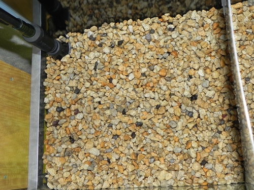 こんにちは、eitaroです。今日、エビ上水槽の立ち上げを実施しましたので報告します。この水槽は、アオミドロが爆殖し、リセットに行き当たりました。 昨日、水槽の清掃を行い、本日立ち上げを実施しました。回収したソイルは、3ケ月なのでつぶれ等がないのですが、アオミドロがいると思うので、実家の母へ、肥料として使ってもらうようにプレゼント??でも、栄養分たっぷりだと思います。 さて、本題の立ち上げですが、まず、底面フィルターを全面に敷き、日向軽石を4L投入しました。 これは、どこかのページで見たのをパクリました。魅力は、軽石が弱酸性をキープしてくれるということなので実施しました。 次にマスターソイルHGを8L投入。結構大粒で思ったとおりです。 その上にマングローブのちからをまんべんなく、2~3g撒きました。 さらに、その上から、旧アマゾニアパウダーを2L投入。なんだか、説明書に底面フィルターに使用できません、と書いてました。養分が溶け出しやすいからなのか?目詰まりを起こすからなのか?わからないため、少々少なめ(1cm厚)の投入となりました。 霧吹きで湿らせながらやっていたのですが、途中で象さんのジョウロに換え散水しました。全体にしみこむまで、15分ほど休憩し、一服。 いよいよ、水の投入です。今回は、ポンプを使わず、重力でポリタンクより、移しました。昨日、湧水を汲みに行ってきたものです。 ソイルは、計14Lほど投入しましたので、約8cmとなりました。 フィルター エーハイム2215(someday号)を接続しました。ろ材は、下から、粗めスポンジ・リングろ材LIFE・サブストラットプロレギュラー・スポンジろ材・ウールマット 以上を入れました。 フィルターを回し始めてすぐの写真ですが、少しにごりがある程度で思ったほどの濁りはありませんでした。セパレート 35cm、25cmそれぞれにエアレーションをかけています。スポンジフィルターも準備していますが、少し様子を見てから投入します。 セット直後の数値 TDS 124ppm 、 ph 6.22アマゾニアの影響でしょうか、phが6.22 素水は、ph7.84です。このぐらいのphで安定してくれるといいんですが...。 この水槽を途中経過を時々UPしたいと思います。 本日は、この辺で eitaro でした。 ポチもよろしくです。にほんブログ村