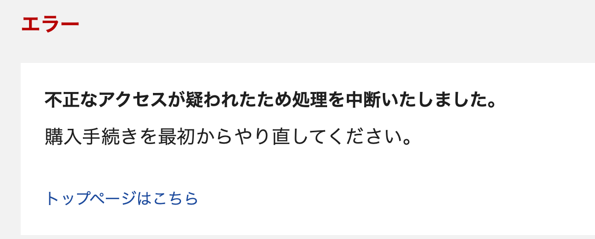 楽天市場で買い物する用事があったので、お買い物マラソンがてらポイントアップにと、Apple Gift Card 認定店 で、Apple Gift Cardを注文しようとしたら・・・何度やってもこれ。以前は終了間際だったのでしかたなかったのかと勝手に納得してましたが、今回もこれで注文できず・・・SMS認証も通ってるし、何が不正なんだろ?