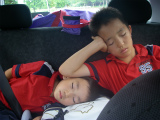 ツイッターではつぶやきまくっているけど、ここでも長男の話をしよう。ええ、もちろんサッカー続けています。(ちなみにあたしも♪)5年生になった4月、区大会等の代表戦に同じチームメートのSくんとHくんはよばれたのですが、Pepは声がかかりませんでした。彼としてはかなり悔しかったみたい。そしてGW。区のトレセン候補に推薦してもらったのですが(チームで5人まで)、2次で落選。同じチームメートはPep以外通り、ここでもかなり凹み、悔しい思いをしました。今まで「勝つ」ことにこだわり、細かいテクニックなどについてダンナがアドバイスをしても「勝ったからいいじゃん」的に聞き流し、細かいボールさばきなどを軽視した結果。本人が一番落ち込み、その大切さを痛感しました。それでもモチベーションをキープし、時間があるときは朝近所の公園でドリブルなどの練習をし(EKも付き合いましたよ!)、区の5年生大会は優勝☆気がつくと同じチームではPep以外ほとんどスクールに通っているという事実。というわけで、フットサルスクールの選抜クラスの選考会に参加し、合格!9月からは空手をやめて、あれだけ軽視していたスクールにも通うことになりました。個人的には空手をつづけたほうがいいと思っている。今でも。7月に(ちょうど選考会と同じ日に)昇級試験も合格し、あと3つで初段黒帯なんだから。。。チームの中では不動のセンターバックとして定着。キャプテンマークは付けなくても、チームの要として機能してきました!そして夏に突入。先日の清水カップに、5年生だけのチームで参加。256チーム中、33位☆ ぱちぱち。8戦中、6勝1敗1分。トーナメントになった初戦に0-1で負けちゃったけど、それ以降は無失点!6勝中、2つはPK勝ち。PK戦になると、こんな試合でもなぜかPepがPKキーパー。最後の試合は、PK戦、5人目のキッカーとしてキーパーグローブつけたまま蹴り、そして勝負を決めました☆相変わらずメンタルは強い、いやますます強くなっているし、(公式戦でPKキーパーをしなかったのは去年の秋の区大会だけ)し、チームメートも「PepがPKキーパーで負けたら仕方ない」という感じ。そして、「蹴りたい人?」とコーチに聞かれると一番最初に手を挙げるらしい。ずいぶん成長した長男!6年生チームにも負けてなかったし(これはチーム全体として☆)、ディフェンダーとして8試合中失点「3」というのはすごいよねー。どんなときにも声出して、チームを盛りたてて(コーチは試合中Pepに指示を出し、ポジショニング等の声がけを彼に任せていました!)、割と冷静に、でも熱く、頑張ってました!全ての対戦相手に「なんだこいつー!」「ちぇっ」って舌打ちされたと、うれしそうでした。というわけで、秋にはトレセンにお呼びがかかるといいなぁ。。。清水カップは月曜日に終了。昨日は一日OFFでしたが、今日水曜日は練習。明日からまた一泊で合宿があり、週末は朝練。まぁ、怪我せず頑張ってくれたまえ!EKは、頑張るなら、これからも一番のFANとして応援するよ!そして、この夏、これだけ楽しませてくれてThank you♪