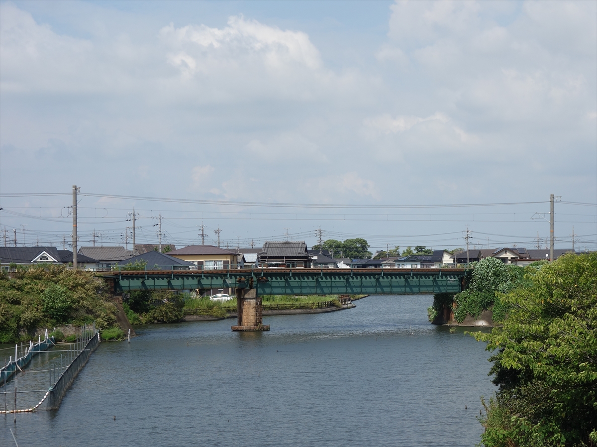 長野県上田市、千曲川の上にかかる赤い鉄橋。