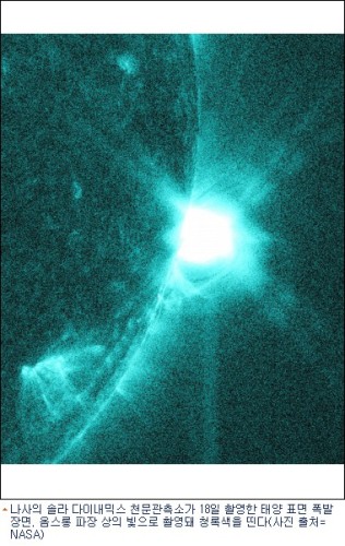 先ほど、韓国サイトDAUMを開けたら、飛び込んできたこのニュース。日本のヤフーではどうかな?と思ってみてみたら、話題にはあまりなっていない。5月ごろや6月に、NASAで爆発があるだろうとか、あったとかという画像や動画はあったけど。記事を要約すると。太陽表面 また爆発・・・粒子は3~4日後地球に到達太陽から地球時間で 18日午後 4時15分, 中間規模の表面爆発(solar flare )があったと米航空宇宙宇宙局NASAが 19日明らかにした。この爆発は 18日午後 4時15分に始まって 45分後の5時に最高潮に達した。 太陽表面爆発は太陽の表面で爆発が発生して巨大なエネルギーを放出するもので、大部分の爆発は地球大気圏をパスしながらエネルギーが消滅するが強い爆発の場合大気圏と GPS(衛星航法装置)、通信信号などを撹乱する可能性がある。ということです。動画も今回のではないですが、1ヶ月ほど前のかな?を見てみましたが、結構すごい大きな爆発ですね。http://youtu.be/ir3MxLcOz1E太陽って、あまり関心を持ってこなかったんですが、中はどうなってるんでしょう。何故爆発が起こるんだろう?富士山の火山が噴火するかもというニュースといい、最近いろんなことがありますね。