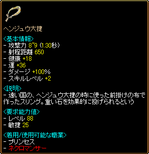 無駄に別キャラで遊んでいます。きっとすぐ飽きます。無駄に連載気味です。突然ですが、私はお酒が好きです。お酒が欲しいです。Uも欲しいです。節制生活Elzです。こんにちわ。とても健康的です。別に固定したりしていません。実は初期値なわけがありません。Uが欲しいのでUについて考えてみました。良Uはどうせ縁がないので、一般的にゴミと言われているものです。ゴミと言われて投売りされたり、酷い時は破壊されたりするUを救済するのです。聖母Elzにふさわしい行為です。Case1. トラップバイトQ. ゴミですか?A. トラップバイトにはスキル+1があります。攻撃速度装備をもっていない知識狼さんにはもしかしたら使えるかもしれません。また、ベースが鉄の牙です。Lv110にもなって鉄の牙を入手できていない物理狼さんは、これを入手することによって火力が大幅UPします。鋼の牙を入手できていない物理狼さんも火力UPです。Case2. ガンバンティンQ. ゴミですか?A. ガンバンティンには総スキル+2効果があります。ウィザードスキルUP効果は高いです。一方で、N品で同様の効果を持つものに、魔法の杖があります。必要Lv126、必要知識200です。Lvでは劣っていますが、知識では勝っています。つまり、クリティカルヒットWIZは魔法の杖よりも早く装備できることになります。補助をかける時にわざわざ装備を変えれば、その有用性は明らかです。Case3. ベイパーボルトQ. ゴミですか?A. 何を勘違いしているのか知りませんが、ベイパーボルトは無限矢です。無限矢といえば大昔は数千万の額で取引されたものです。元が毒の矢でダメージにも属性攻撃にも期待できませんが、無限矢は貴重品でした。今も貴重品に違いありません。3つのUを破壊の淵から救いました。素晴らしいです。もっと褒め称えても良いですよ。Case4. バイパートゥースQ. ゴミですか?A.