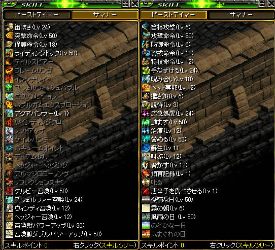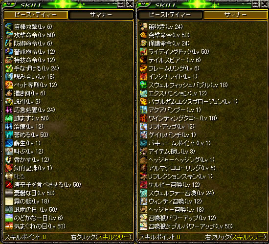 4月になったので環境が色々と変わります。電車には新入社員君が乗っています。初々しいですね。私の方が初々しいですけれどね。永遠の17歳Elzです。こんにちわ。鯖は落ちてますから鯖読みできません。舞>落ちたの?存じません。誕生日をお祝いするのを忘れておりました。面倒だっただけですけれどね。324歳の誕生日はもう迎えております。でも永遠の17歳です。次の誕生日はLv361です。スキルがこうなりました。とても理想的ですね。テイマとサマナの左右を間違えましたが面倒なのでこのまま行きます。将来的にはゲイルパンチと鳥召喚をマスターしてやります。フォームガードを持ってサマナになってやりますよ。サマナは可愛いですね。とても可愛いです。食べてしまいたいです。じゅるり。今はどう見てもテイマですが…いつかきっと。まぁ今でも私の方が可愛いですけれどね。