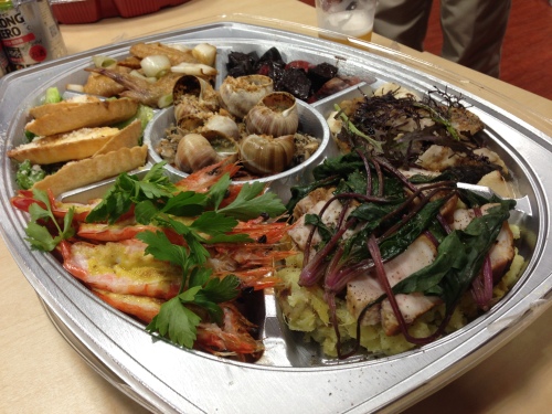 職場でYear-end partyと題した忘年会がありました。職場でと言うのは、文字通り職場の敷地内で催されたわけです。夏にはSummer partyと言う名の暑気払い?があったのですが、悩んだ挙句に欠席。今回は試しに出てみよう、つまらなかったら次回からはパスしようと思い臨みました。場所は講堂。毎回抽選で幹事となる研究室を選ぶのだそうで、抽選に参加しない研究室は自動的に次の幹事に決定だそうです。幹事によってやることも結構違うようで、過去にはバンドの生演奏が入ったり、大抽選会でiPadが当たったりと言うこともあったとのこと。今回は地味だ~と周りは言ってましたが、えるざ的には初体験なので比べるものがなく、こんなもんなんだ、へー!と言う感じ。お料理はこんな感じ。このほかにお寿司とかパスタとかお菓子ももありました。もちろん飲み放題で、ビールはもちろんワインボトルもずらっと並んでいました。外国の学生さんたちはエスカルゴを食べたことがないとかで、肝試し的に食べていました。一応スタート時間も終了時間も決まっていましたが、何となくバラバラ集まって何となくスタート。終わりの時間にいたっては全く無視され、若い学生さんたちは朝までそこで大騒ぎすることもあるそうです。まあ、お店ではなく自分たちの施設だからできるわざです。もちろん立食なので、食べ物のあるテーブルにフラフラと言っては、また別のテーブルにフラフラと移動する人がたくさん。研究室は違えども、みんな顔なじみはたくさんいるので、かなり和気藹々とした雰囲気でした。ちなみにこの二人はえるざの研究室のインターナショナルスチューデントさんたち。肝心な次回の幹事を決める抽選会は、黒ひげ危機一髪での勝負となりました。さすがに理系の頭脳が集まる集団だけあって、黒ひげにナイフを刺すたびに、自分たちの当たる確立を計算して出そうとするあたりチョット笑えました。普通に楽しかったのですが、えるざはそこから高速道路を使って帰らなければならないので、適当なところで引き上げました。これが金曜日の夜だったらもっと気兼ねなく楽しめたのでしょうけどね。にほんブログ村