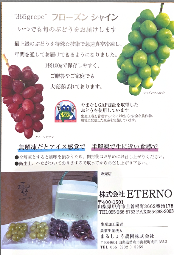こちらは、先日の八王子花火大会で知り合った青年Mさん(ETERNO)が扱っている「冷凍ぶどう」。